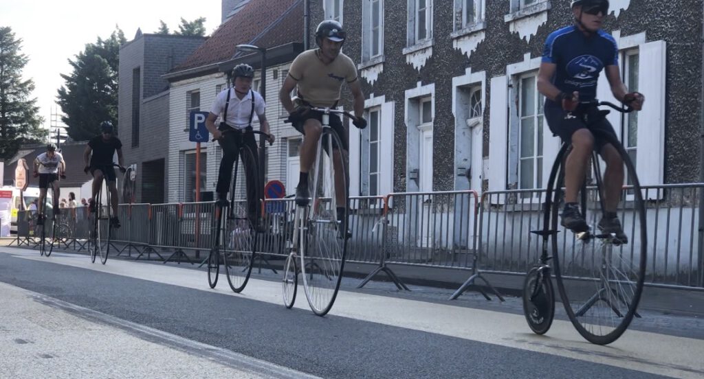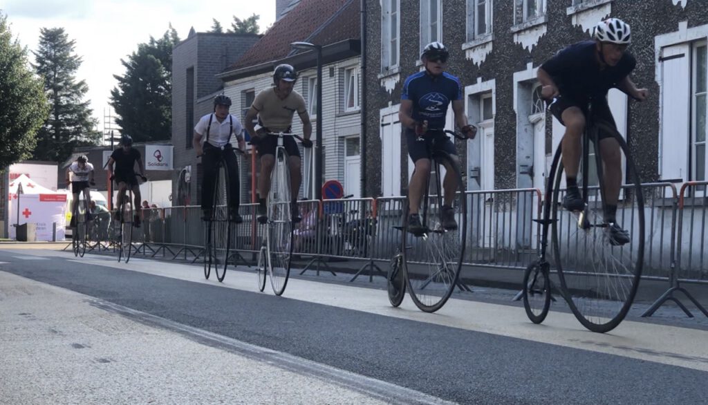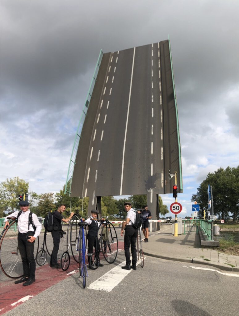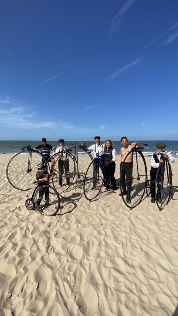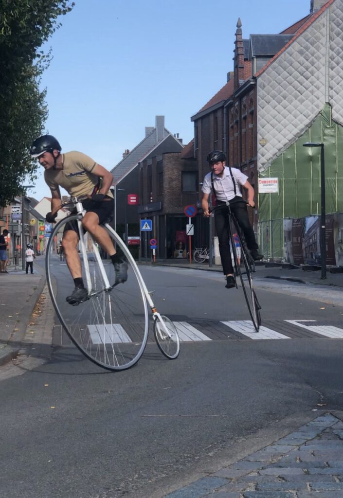 Am Abend, in der Dämmerung, erreichten wir endlich Oudenburg. Veranstalter Eric begrüßte uns herzlich. Unser „Campingplatz“ war ein Fußballfeld – mit Strom von den Nachbarn und Sanitäranlagen in den Turnhallen. Dort trafen wir auch andere Hochradfahrer, darunter den Tschechen Dušan Mihel mit seinem Freund Todd aus Colorado, den Deutschen René Seidenberg aus dem Sauerland sowie unsere Freunde Frank und Evi. Der erste Abend war ein gelungener Einstieg ins große Hochradtreffen.