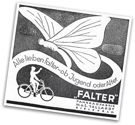 Max Tallardt gründet gemeinsam mit seiner Frau die „FALTER“-Fahrrad-Fabrik: Die ersten Kurbeln drehen sich in bescheidenen, gemieteten Räumchen in der heutigen Johanniswerkstraße. Am 22. März 1927 wird feierlich das erste „FALTER“-Rad fertiggestellt – Lackiermeister Flassbeck und Tochter Edelgard sorgen dafür, dass der Rahmen glänzt und die Sattelbahn stimmt.